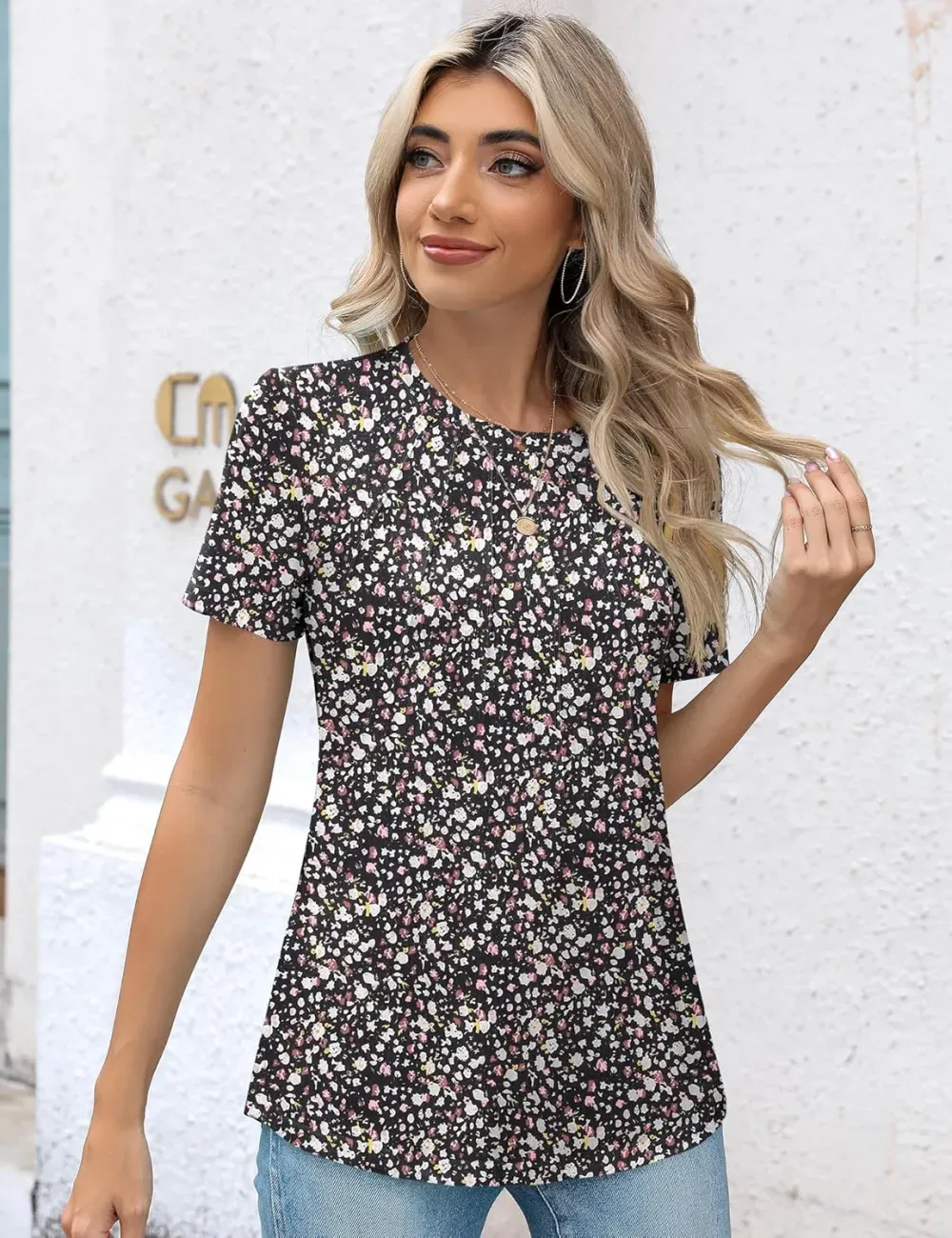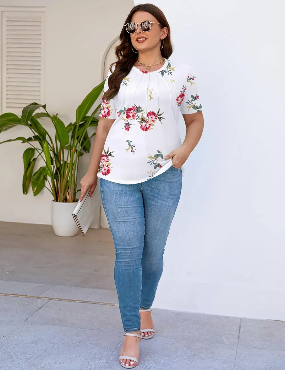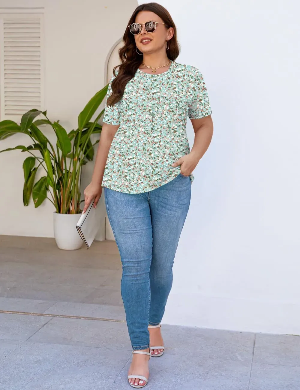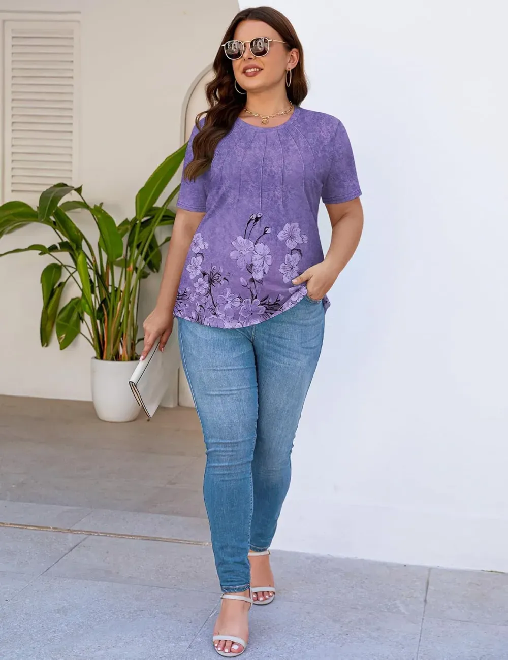 • Kistore Womens Casual Crew Neck Short Sleeve Pleated Tops Blouses Fashion Clothes 2024