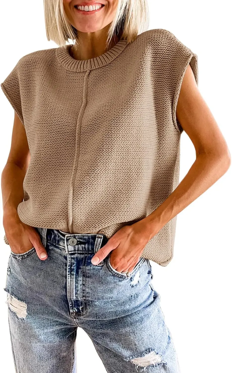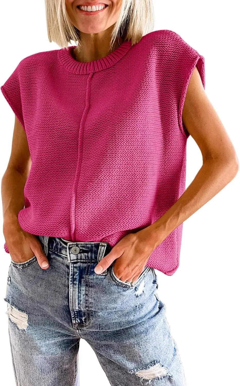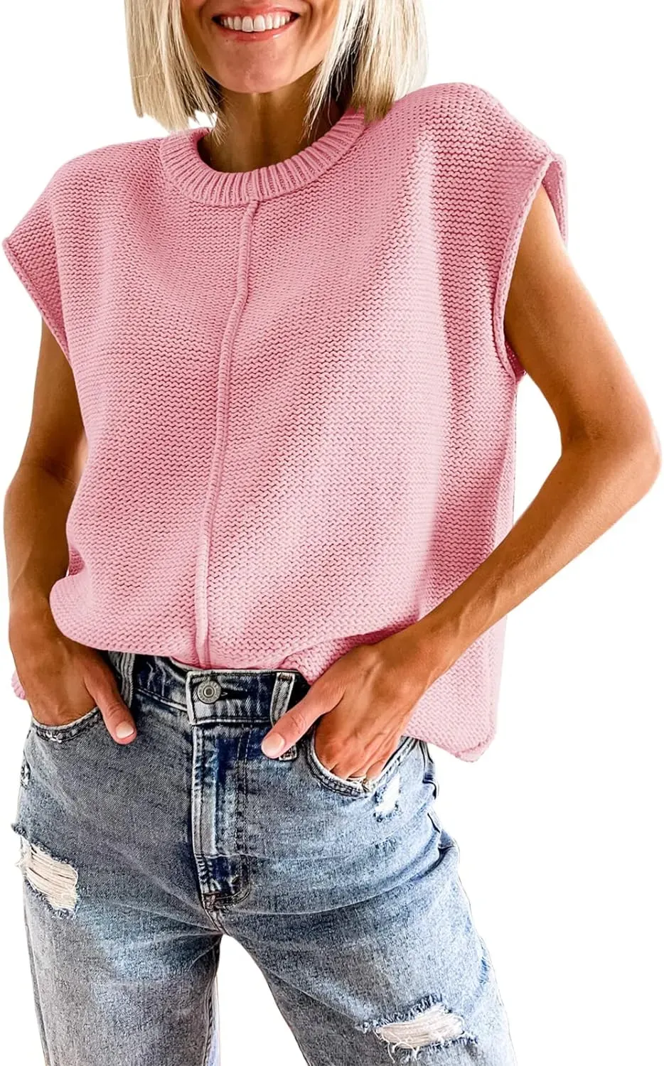 • Saodimallsu Womens Summer Cap Sleeve Tops Casual Crew Neck Loose Fit Knit Lightweight Sweater Pullover Top