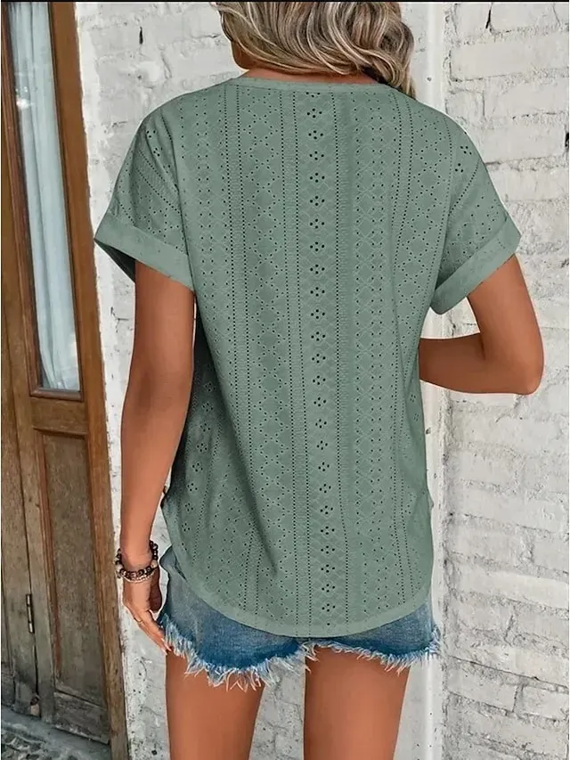 • Women's T shirt Tee White Eyelet Tops Light Blue Black White Plain Cut Out Short Sleeve Daily Weekend Basic Round Neck Regular Cotton S