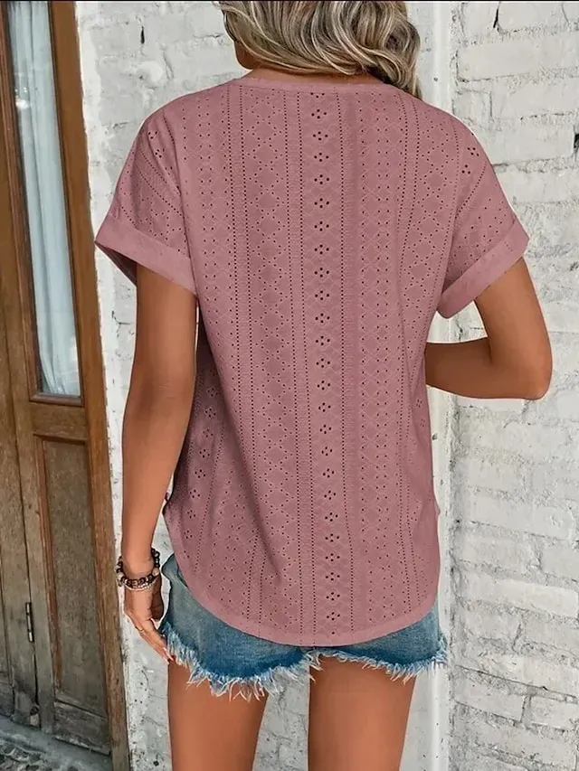 Gender:Women's, Style:Basic, Occasion:Weekend,Daily, Tops Type:White Eyelet Tops,T shirt Tee, Neckline:Round Neck, Fabric:Cotton, Design:Cut Out, Sleeve Length:Short Sleeve, Elasticity:Micro-elastic, Look After Me:Machine wash,Wet and Dry Cleaning,Washable, Pattern:Plain,